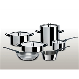 Batteria di pentole trilamina (AISI 430, alluminio, acciaio inossidabile 18/10). Collezione : Officina Alessi Design: Richard Sapper. Consulente: Gualtiero Marchesi