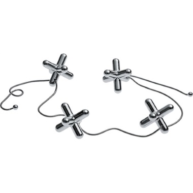 Potrebbe sembrare un gioiello, questo sottopentola del giovane designer Gabriele Chiave. E’ pensato per essere appeso a un gancio da cucina e poi preso e lanciato, come fossero dei dadi, sulla tavola. Una volta adattata la sua disposizione in tavola diventa una base su cui appoggiare una pentola, una teglia, un piatto da portata.
