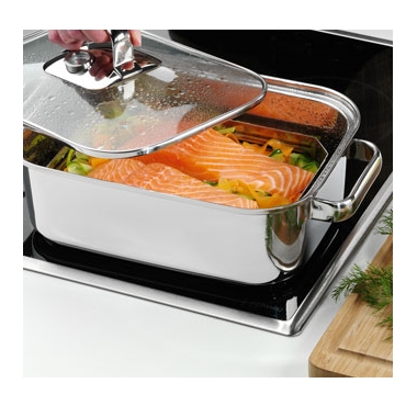 La rostiera può essere utilizzata per cotture tradizionali, per rosolare, stufare e per la cottura di soufflé; il coperchio in vetro con termometro integrato consente di controllare l’andamento di cottura.